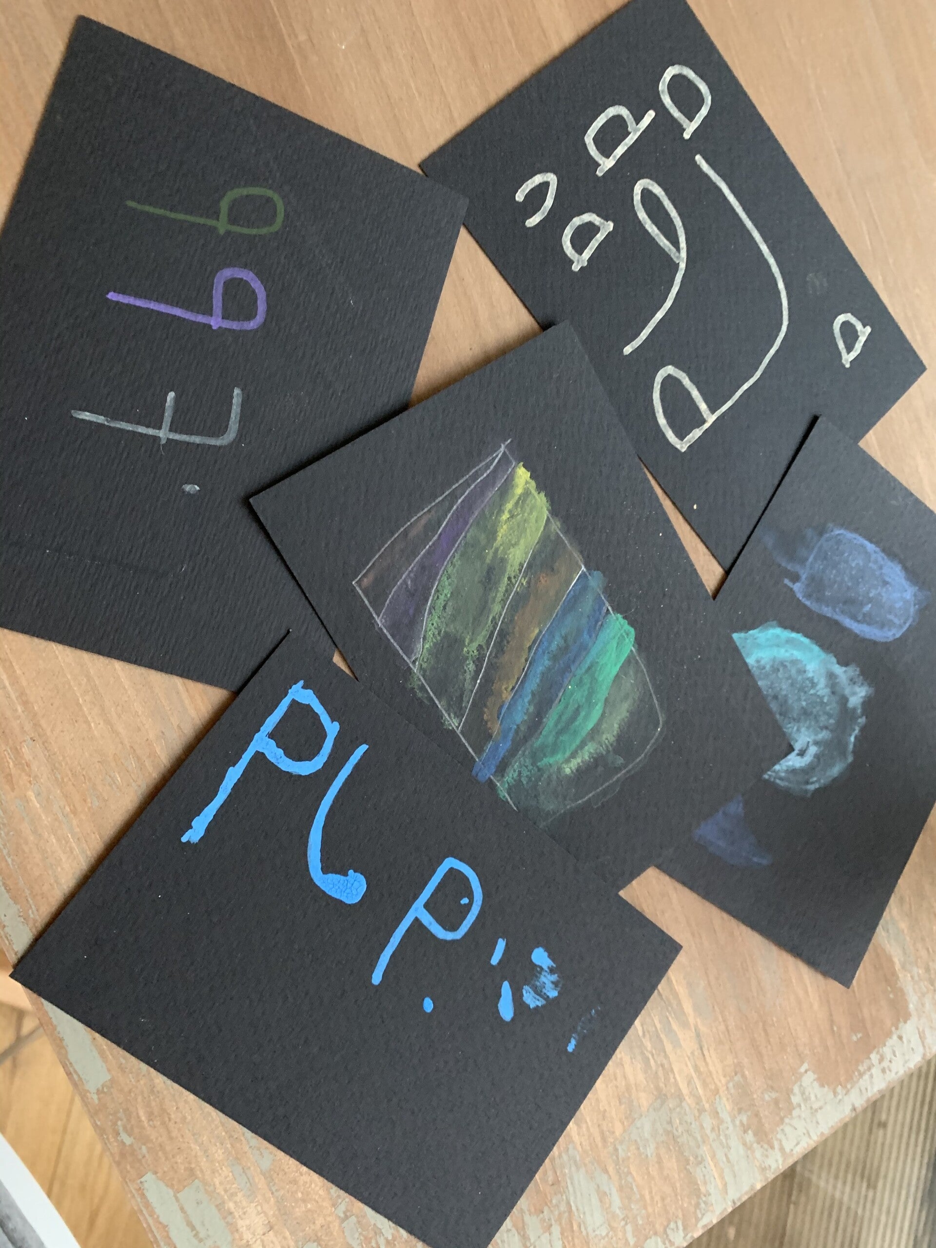 Door Vincent gemaakt setje van vijf kleurrijke kaarten op zwart papier. Geen kaart is hetzelfde en daardoor dus uniek.